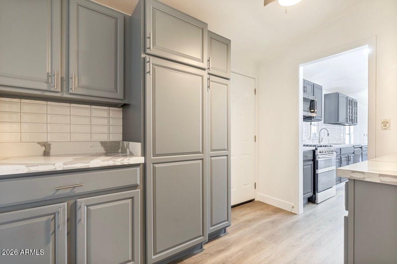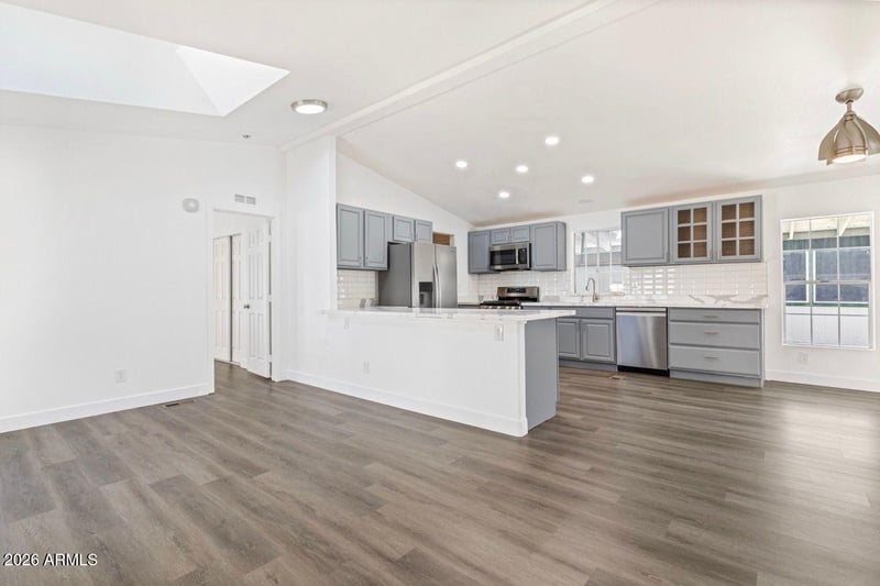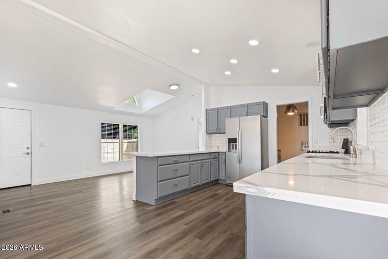 Listing details for 11275 99th Ave #61, Peoria, AZ 85345 : Beautifully updated home featuring a bright, open-concept floor plan and modern finishes throughout. The stunning kitchen is the centerpiece of the home, complete with quartz countertops, subway tile backsplash, custom gray cabinetry, stainless steel appliances including a gas range, built-in microwave, dishwasher, and refrigerator, plus a large island ideal for entertaining. The spacious living area offers vaulted ceilings, recessed lighting, and a skylight that fills the home with natural light. Wood-look flooring runs seamlessly throughout, creating a clean and cohesive feel. The updated bathroom showcases a designer tile surround, modern vanity with quartz counters, and upgraded fixtures. Bedrooms are generously sized with ample closet space and ceiling fans for added comfort.