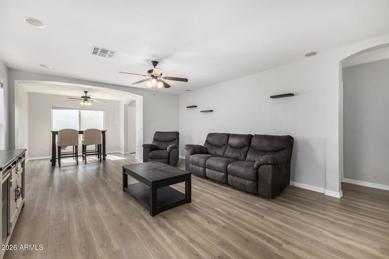 Listing details for 11329 Austin Thomas Dr, Surprise, AZ 85378 : Gorgeously remodeled home in an exclusive GATED Surprise community. The home features a large living room complete with built in surround sound. The dining room leads into the kitchen complete with stainless steel appliances, a top of the line induction cooktop, freshly updated cabinets and tile flooring along with a pantry. The bedrooms all feature brand new carpet with the primary bedroom featuring a large, brand new walk in tile shower, dual vanity sink, and walk in closet. The secondary bedrooms are all spacious with good closet space. The second bathroom features a walk in shower as well. The backyard is private, spacious, low maintenance and ready for entertaining with turf, pavers, and a covered patio. Great neighborhood with parks, walking trails, and top rated PEORIA SCHOOLS!