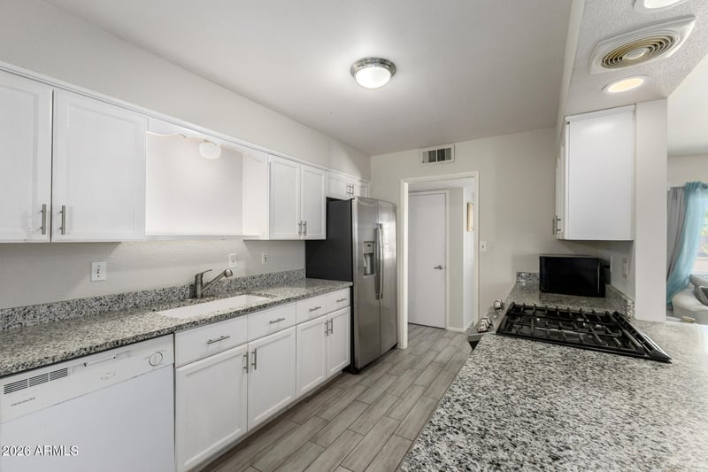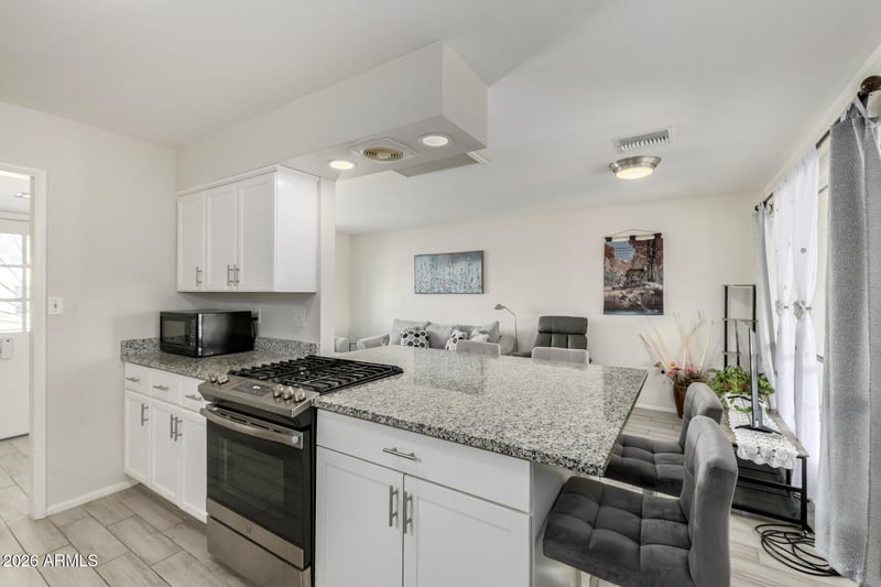 Listing details for 11467 Desert Hills Dr, Sun City, AZ 85351 : This beautifully updated and fully furnished 2-bedroom, 2-bath home is move-in ready and packed with upgrades! The stylish kitchen features granite countertops, a wrap-around breakfast bar, updated cabinetry and hardware, stainless steel appliances, and durable plank tile flooring that flows seamlessly throughout the home.