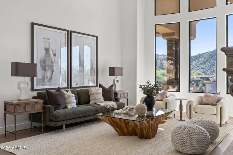 Listing details for 11475 Paradise Ln, Scottsdale, AZ 85255 : Where desert sunsets, star-filled skies, and mountain stillness set the rhythm of each day. Set against the McDowell Mountains on the edge of the Sonoran Desert Preserve, this thoughtfully reimagined custom estate rests within the guard-gated enclave of Hundred Hills at McDowell Mountain Ranch. Positioned on a 1.2-acre hillside cul-de-sac lot, the Modern Mediterranean residence offers privacy, scale, and sweeping mountain and city-light views. Approximately 5,200 square feet of step-free main living is complemented by a ground-level retreat ideal for guests with a dedicated home theatre. Carefully remodelled throughout, the home balances refined finishes with effortless livability. Outdoors, a negative-edge pool and spa invite quiet mornings, sunset swims, and evenings under the stars. A winding drive leads to generous guest parking and a 2,400-square-foot garage accommodating 4+ cars. Just 30 minutes from Sky Harbor Airport, with easy access to desert trails and the full McDowell Mountain Ranch amenitiesincluding pools, pickleball, tennis, aquatic centre, library, community centre, and schoolsthis is a rare blend of seclusion, lifestyle, and everyday convenience.