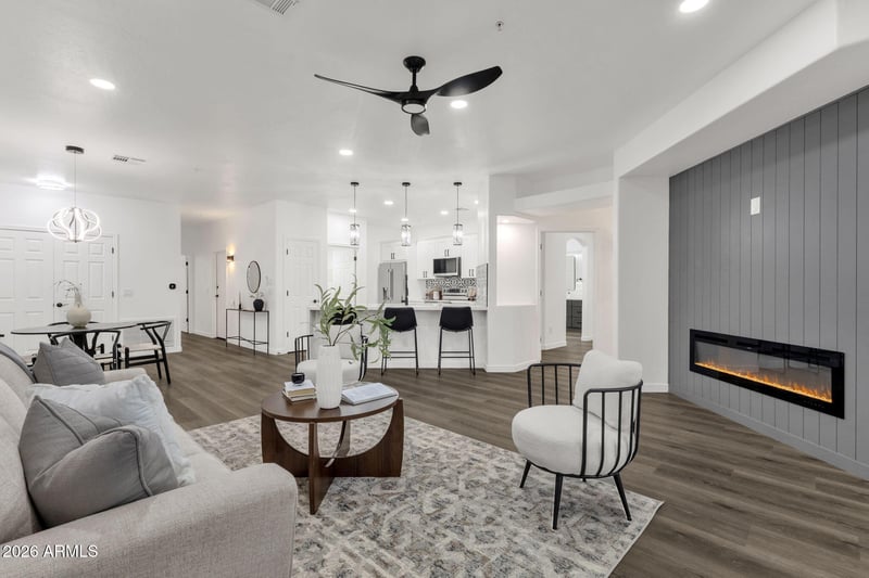 Listing details for 11500 Cochise Dr #1030, Scottsdale, AZ 85259 : Experience refined living in the exclusive Mirage Crossing Resort! This stunning designer remodel radiates elegance and charm. The office easily transforms into a 3rd bedroom. Showcasing premium flooring and paint, Calacatta Rafael quartz counters, soft-close cabinetry, designer faucets, new sinks, modern lighting, and top-tier kitchen appliances. Entertain guests with a stylish bar, unwind near the custom fireplace, or relax on your private patio. Spa-inspired bathrooms feature new vanities, designer mirrors, and upgraded fixtures. Enjoy resort-style amenities including gated community, walking paths, heated pool & spa, BBQ areas, a clubhouse, banquet/meeting rooms, and fitness center. This corner unit rests at the rear of the community providing added privacy. A true luxury retreat!