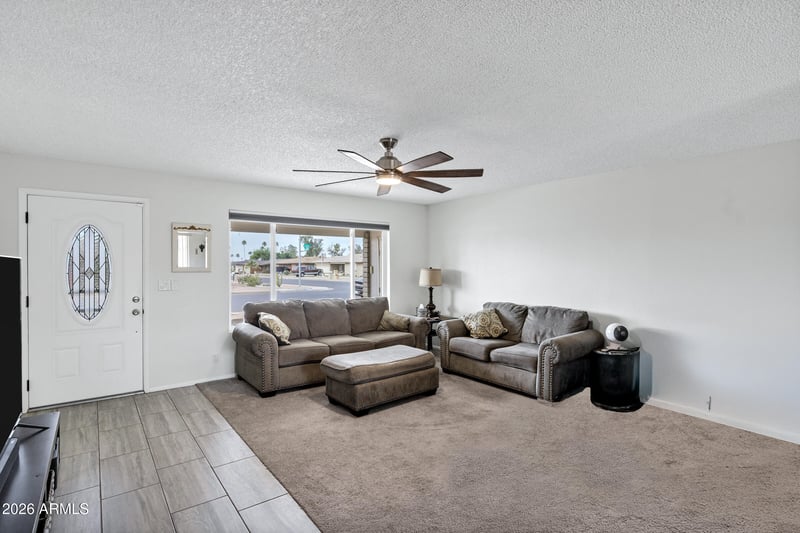 The open living and dining areas flow together nicely, creating a functional layout for everyday living and entertaining. The kitchen features warm wood cabinetry and built-in appliances, offering both convenience and practicality. Step outside to the covered back porch, an ideal place to relax and enjoy Arizona's outdoor living year-round.