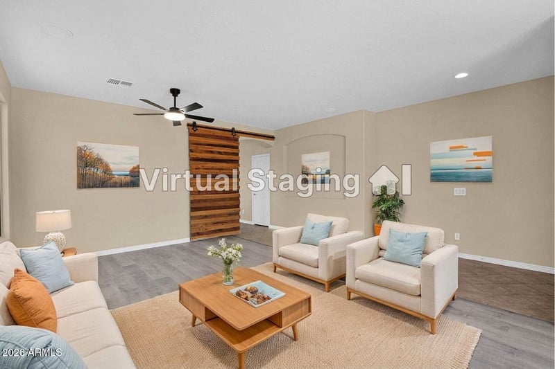 Listing details for 11555 Virginia Ave, Avondale, AZ 85392 : Set on an oversized lot with a backyard designed for real Arizona living, this single level home delivers the space, layout, and upgrades that buyers are looking for. From the front door, you're welcomed into an expansive living room with a custom barn door where natural light and clean lines create a sense of calm and flexibility. Whether it's quiet nights in or hosting a full house, this layout adapts to your life. The kitchen is positioned exactly where it should be: right at the center of it all. A large island with a beverage refrigerator anchors the space, surrounded by ample cabinetry and counter space, plus a stainless double oven setup that makes everyday meals or holiday hosting feel effortless. The kitchen opens seamlessly into the family room, so you're never cut off from the moment. The primary suite offers a generously sized space, large windows, and an ensuite bathroom featuring dual vanities, a soaking tub, and separate shower. Additional bedrooms are split from the primary, well-sized, and ideal for family members or guests. Plus, there is a separate den, perfect for a home office.