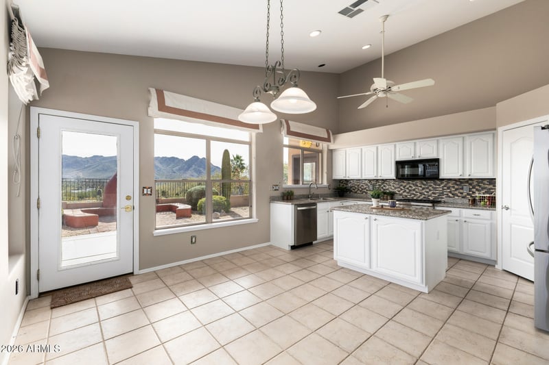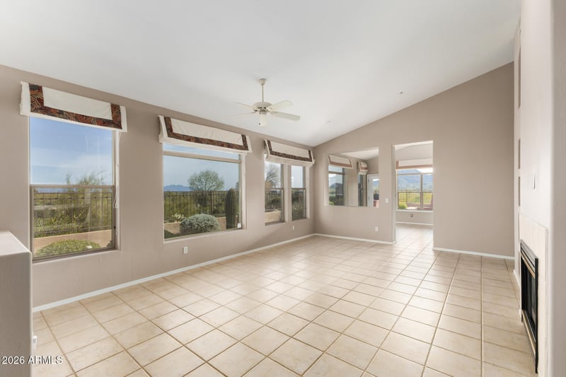 Listing details for 11569 Bronco Trl, Scottsdale, AZ 85255 : Unobstructed panoramic views including Four peaks, Toms Thumb & Troon Mt. This stunning view is rarely found in a home of this price. Enjoy sunrises from south facing rear patio, setting sun around the kiva fireplace & buillt-in gas BBQ. Expansive open floor plan features vaulted ceilings, loaded with windows providing picturesque views from inside the home. Den off entry & guest ensuite with full bath. Primary suite split with french door to patio & breathtaking views from the bed! Primary bath has updated shower, tile floors & custom closet. You must see the sweeping view from the kitchen! Wolf range, SS LG refrigerator & dishwasher, walk-in panty & island create a perfect working space. Upgraded garage door. Cul-de-sac lot no homes behind. This view is worth some buyer updating!