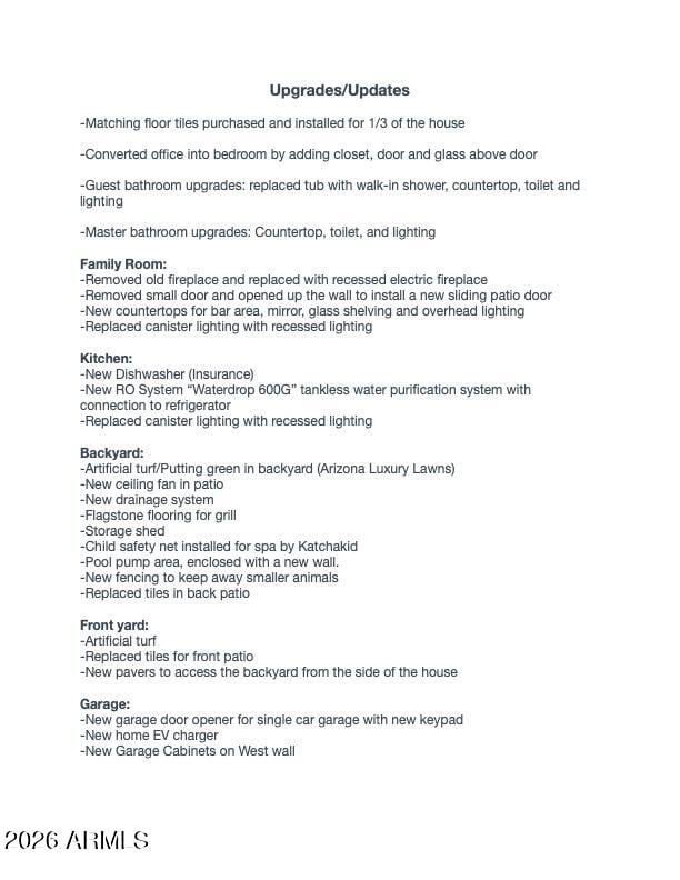 Listing details for 11665 Carol Ave, Scottsdale, AZ 85259 : Become the proud owner of this gorgeous property in Stonegate! Discover a 4-bed/2-bath, 3-car garage and a beautifully landscaped front yard with mature trees and pristine artificial turf. Fall in love with the captivating living room, which features vaulted ceilings, half-moon windows for abundant natural light, a soothing palette, and durable tile flooring. Spend intimate moments with loved ones in the spacious great room, complete with a dry bar for entertaining and a cozy fireplace. The stunning chef's kitchen includes granite counters, elegant white cabinetry with crown moulding, a tile backsplash, stainless steel appliances, and a peninsula with a breakfast bar for casual dining. The luxurious primary bedroom boasts double French doors leading to the backyard for seamless . . . indoor-outdoor living, classic plantation shutters, a lavish ensuite with dual sinks, and a walk-in closet. Imagine peaceful evenings in the enchanting backyard, which features a covered patio, stylish pavers, a relaxing spa, and a putting green for golf enthusiasts. Don't miss out on this incredible gem! *Please see docs tab for a full list of upgrades*
