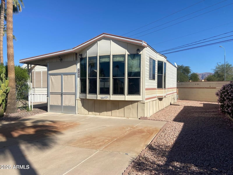 Listing details for 1177 Kiowa Cir #177, Apache Junction, AZ 85119 : Own the land in this 55+ golf course resort. Here is your chance to own a winter home in great condition at a small price! This older unit will impress! There is a long list of upgrades that include a new AC/heat in 2025, 2024 new roof, rebuilt kitchen including new appliances, solid surface flooring throughout. Over the top bathroom renovation including a spacious walk-in shower. New water heater in 2019. Recently added sunscreens surround a large Arizona room with attached shed/laundry. Comes with a termite warranty and all documentation for the work that has been done. Turn-key!