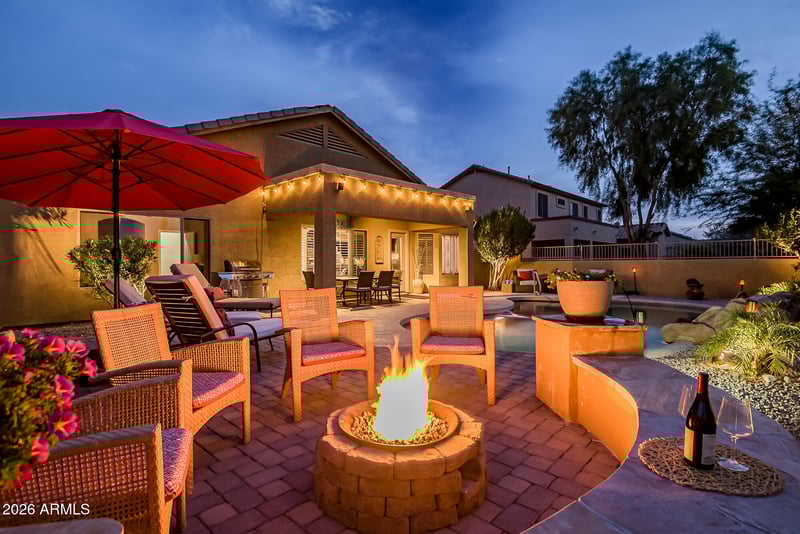 Listing details for 11778 175th Ln, Goodyear, AZ 85338 : Beautifully restored 3-bedroom, 2-bath masterpiece showcasing vaulted ceilings and abundant natural light throughout. The chef's kitchen features elegant granite countertops and custom window treatments, seamlessly flowing into open living spaces ideal for entertaining. Step outside to a resort-style backyard complete with a sparkling Pebble Tec waterfall pool, multiple outdoor fire pits, extended patio, and professionally landscaped yard—perfect for enjoying breathtaking sunset views. The home is enhanced by stone exterior trim, an extended garage, and the rare privacy of two sides backing to a serene greenbelt. A true indoor-outdoor retreat combining style, comfort, and exceptional outdoor living.