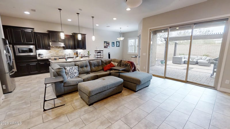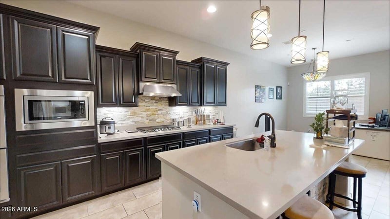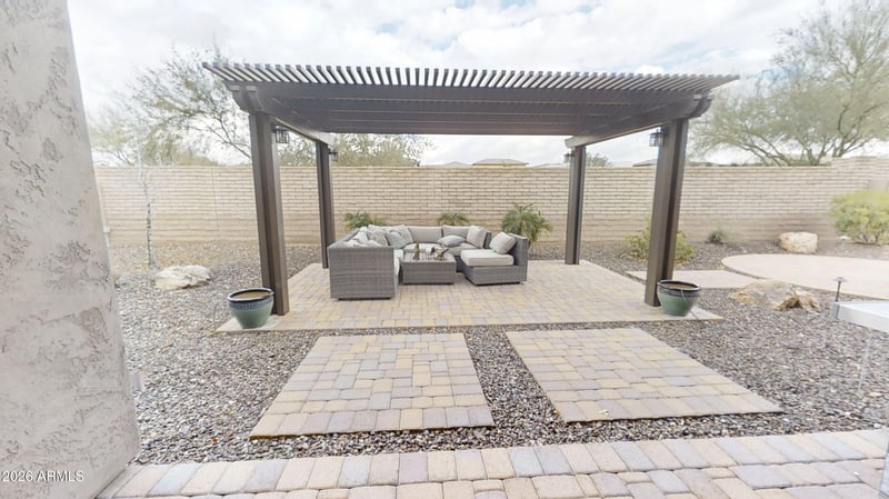 Listing details for 11850 Lone Tree Trl, Peoria, AZ 85383 : Single-level home in the sought-after Vistancia community of Peoria featuring an open great-room floor plan with tile flooring throughout main living areas and abundant natural light. The kitchen includes stainless steel appliances, dark cabinetry, stone backsplash, large center island with seating, and ample counter space. Dedicated office/flex area ideal for remote work. The primary suite offers a spacious layout and a spa-style bath with dual sinks, soaking tub, walk-in shower, and walk-in closet. Backyard includes paver patio, pergola, PVC irrigation, and buried gas line for outdoor grill. Additional features include natural gas, whole-home water filtration system, covered patio, and low-maintenance desert landscaping.