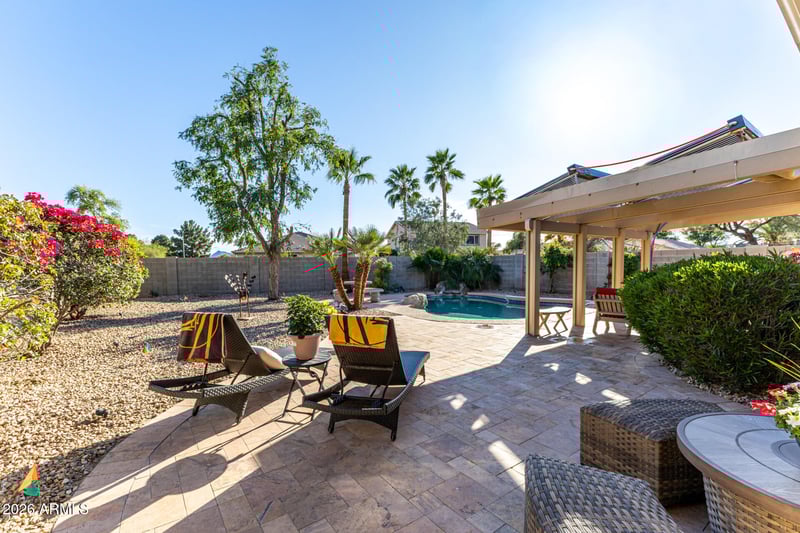 This Huge professionally landscaped lot with a six foot high privacy fence, mature trees, flowering bushes, and fresh sweet oranges on the tree, surround your Backyard retreat. A beautiful sparkling pool with waterfall completes the lifestyle. There are two covered patios, one of which supports the solar pool heating system while the other has a misting system for those hot days. The main area is travertine tile in all walking areas and then a low maintenance washed gravel covers the balance of the yard. You are here to relax!