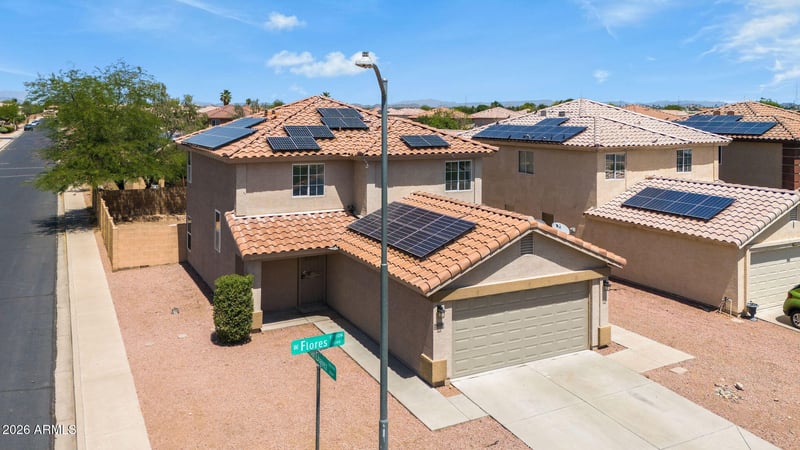 Listing details for 11950 Flores Dr, El Mirage, AZ 85335 : Situated on a desirable corner lot, this inviting 4-bedroom, 2-bath home with a private pool offers a spacious and versatile layout designed for comfortable living. The primary suite is conveniently located downstairs, providing privacy and ease, while an upstairs loft creates the perfect space for a home office, media room, or additional living area. Enjoy Arizona living at its finest with a sparkling backyard pool, ideal for relaxing or entertaining