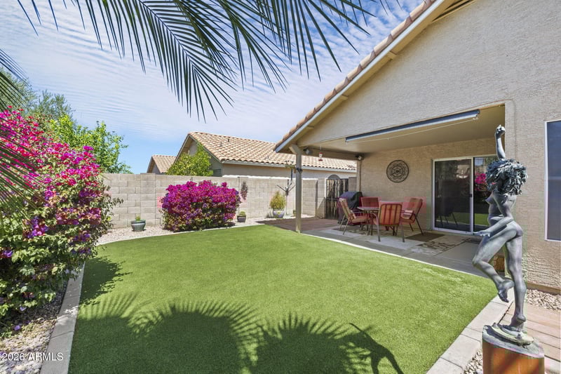 Listing details for 12002 79th Dr, Peoria, AZ 85345 : Located in the Garden Point subdivision, this 3-bedroom, 2-bath home offers convenient access to Loop 101, Arrowhead Towne Center, and the Westgate Entertainment District... The HOA maintains front yard landscaping for consistent curb appeal...Interior features include vaulted ceilings in the living room, ceiling fans, and an updated kitchen with granite countertops and stainless steel appliances...Flooring throughout the home is tile (no carpet)...The backyard is designed for low maintenance, featuring attractive desert landscaping and artificial turf...New AC installed in 2025...Located in the desirable Peoria School District, home is a turn-key possibility with most of the furnishings, housewares, and decor available outside of escrow.