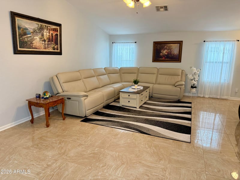 Listing details for 12008 Acapulco Dr, El Mirage, AZ 85335 : A gorgeous home, with 4 Bedrooms, 2 full baths, large kitchen island with beautiful granite done in 2017, beautiful flooring throughout the home, high ceilings, split floor plan, garage with cabinetry, painted t/out inside in 2024, appliances new in 2018, and this home is greatly cared for, with covered patio and fruit trees in this cozy back yard, and for your buyer, without anything to be done!!
