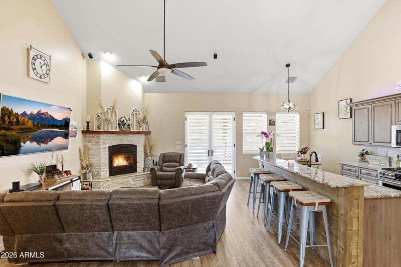 Listing details for 1206 Bolivar St, Payson, AZ 85541 : Gorgeous single-level home built in 2020, ideally situated on 5 acres within town limits in Payson! Offering 2,085 sq. ft. of thoughtfully designed living space, this 4-bedroom, 3-bathroom home features a desirable split floor plan, private well, durable metal roof, and an attached 2-car carport with potential for easy conversion into a garage. Plans are also available for a future 60x40 detached garage--perfect for additional storage, a workshop, or recreational toys. Step inside to a bright and inviting living room with vaulted ceilings, surround sound, luxury vinyl plank flooring, and a cozy wood-burning fireplace--ideal for enjoying cooler mountain evenings. The open-concept kitchen is designed for both everyday living and entertaining, complete with granite countertops, a breakfast bar, and a spacious walk-in pantry. The private primary suite offers direct access to the covered back patio and features a spa-like bathroom with dual sinks, a jetted soaking tub, a large walk-in shower with dual shower heads, a private water closet, and a generous walk-in closet. Two of the additional bedrooms also include walk-in closets, while the guest bathroom provides dual sinks and ample storage. Enjoy outdoor living at its finest with a large covered patio--perfect for summer barbecues, relaxing, or taking in the surrounding space. With 5 acres, there's endless potential to create your dream backyard, add amenities, and the property backs the new Granite Dells Park Complex.
