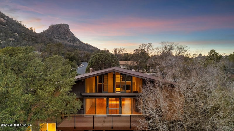 Listing details for 121 Rocky Dells Dr, Prescott, AZ 86303 : Mid-Century Modern home with Thumb Butte as your stunning backdrop in a quintessential Prescott setting. A level driveway and easy entry welcome you home. Inside, rich red oak solid wood flooring flows throughout the main living area. Step into the great room and immediately experience the striking wall of windows framing panoramic views of pine trees, boulders, and mountain views--bringing the outdoors in with natural light and year-round beauty. The remodeled kitchen is both sleek and highly functional, featuring maple cabinetry with pull-outs and a mixer lift, buttermilk quartz countertops and backsplash, a JennAir refrigerator, 36'' Wolf dual-fuel range with Zephyr vent hood, and Bosch dishwasher--an ideal space for everyday living and entertaining alike. The split floor plan offers privacy and comfort. The primary bedroom is spacious and the beautifully appointed bath has custom tile shower with built-in bench, maple cabinetry. Two guest bedrooms and an updated guest bath with limestone tub enclosure provide ample space for family and visitors. The back deck is just off the great room, complete with TimberTech composite decking, cable railing, and a Brazilian Walnut IPE drink rail--perfect for outdoor dining, birdwatching, and stargazing under Prescott's clear skies. The lower level adds versatility with a studio featuring a ¾ bath, large closet, and private exterior access--ideal for guests, creative space, or home office. A 552 sq ft heated and cooled workshop includes a utility sink, cabinets, shelving, and its own exterior entrance--ready for hobbies, projects, or storage. The 2 car garage has additional storage and windows for natural light. New Roof in 2024. Originally built in 1973, this meticulously maintained home showcases Mid-Century character and thoughtful modern updates. Please refer to the features list for additional details on this exceptional property.