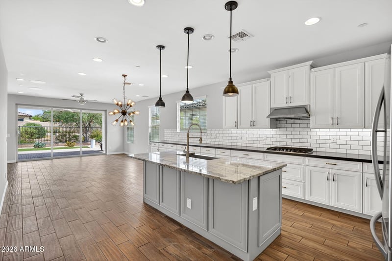 Listing details for 12124 Peak View Rd, Peoria, AZ 85383 : This home may be the perfect choice. You'll love the kitchen, w/staggered white cabinets, granite, a gas range & a huge island. Perfect for entertaining. It overlooks dining in the great room, which is accented by a wide wall of windows to take in the views of the backyard & common area. The Primary suite is split from the other two bedrooms. Like the other rooms it has a ceiling fan, & the ensuite bath is pure luxury: dual sinks, glass walled shower, a soaking tub, & a huge walk in closet. The second bedroom is at the front of the home, It has direct access to a jack n jill bath w/a full showier, making a perfect guest suite. The 3rd bedroom is also split. There's a 3 car tandem garage w/epoxy. Out back is a covered patio and a sun patio, artificial turf, & view fencing to common area.