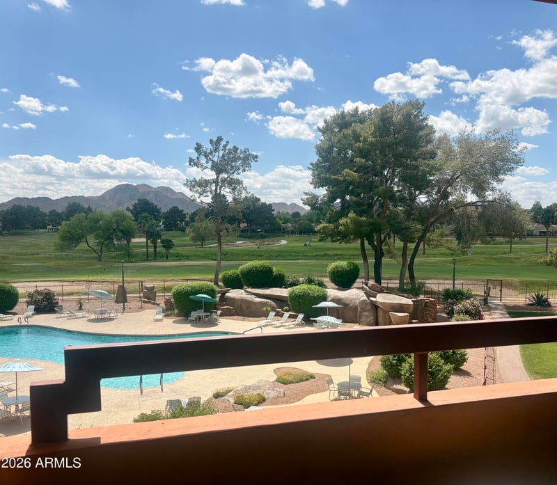 Listing details for 12212 Paradise Village Pw #338, Phoenix, AZ 85032 : Anasazi Resort living in esteemed building 14 boasts unmatched views of the pool, golf course, and mountains. This turnkey property includes all contents and features a large balcony in a tranquil setting away from noise. The kitchen is spacious with granite countertops, a breakfast bar, stainless steel appliances, and ample storage. The living room has a mechanical sun shade, while the bathroom includes a double sink vanity with granite countertops. The AC unit was updated in 2022. Anasazi Village offers elevator-accessible buildings, 22 acres of greenery, a cactus garden, and 5 resort-style pool and spa areas. The clubhouse features two fitness centers, a media center, a billiards room, and gathering rooms for activities. Walk to the new PV, Stonecreek Golf Course, Target, Costco, Dutch Bros and dozens of upscale shops and restaurants. Great access to Loop 101 and I-51. Concrete block construction, not wood frame!