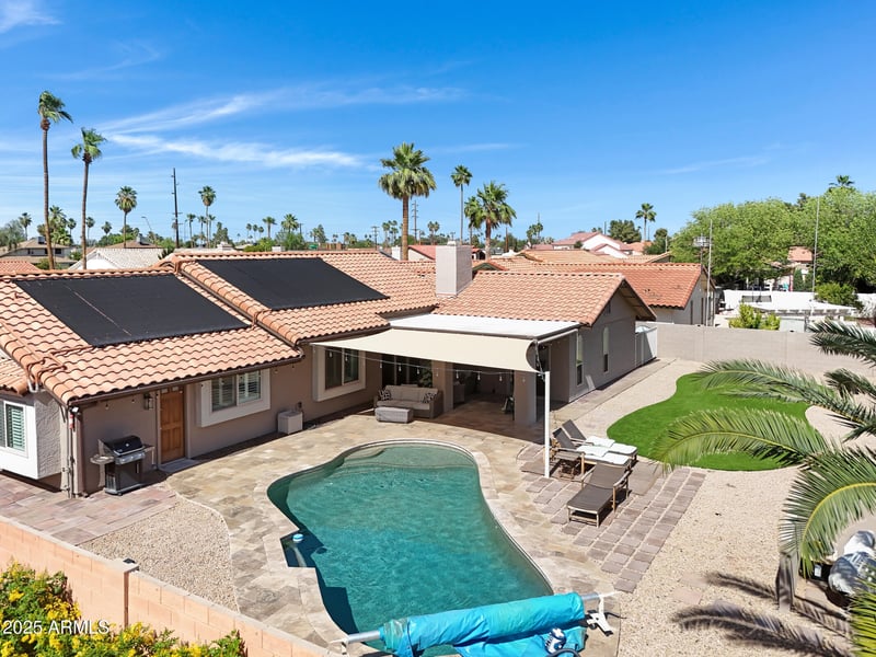 Huge master bedroom exits out to back patio, which is awesome for entertaining or unwinding after a long day. Artificial turf is perfect for your fur babies! Covered patio features travertine tile flooring extending out around pebble tec pool w/ Baja shelf, and SOLAR heating pool filtration. Pool feels comfortable most all year round and without the high energy bills! Pool cover included and durable. Extended shade covers and string lights great for entertaining guests. RV gate equipped, so come bring all your toys. All furniture can be included, for the right price. This can make for a PERFECT STR! Within walking distance from shopping & parks, & centrally located between the 60, 101, 202, & I-10 freeways, you'll have access to all the shopping, dining & amenities you could ask for!
