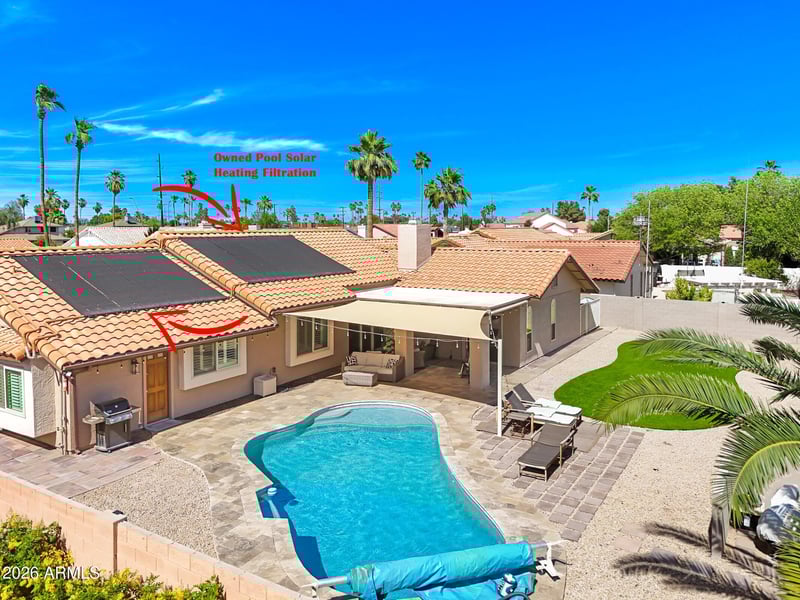 Huge master bedroom exits out to back patio, which is awesome for entertaining or unwinding after a long day. Artificial turf is perfect for your fur babies! Covered patio features travertine tile flooring extending out around pebble tec pool w/ Baja shelf, and OWNED SOLAR heating pool filtration. Pool feels comfortable most all year round and without the high energy bills! Pool cover included and durable. Extended shade covers and string lights great for entertaining guests. RV gate equipped, so come bring all your toys. All furniture can be included, for the right price. This can make for a PERFECT STR! Within walking distance from shopping & parks, & centrally located between the 60, 101, 202, & I-10 freeways, you'll have access to all the shopping, dining & amenities you could ask for!
