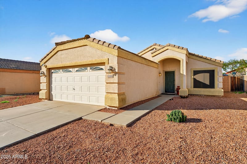 Listing details for 12326 Flores Dr, El Mirage, AZ 85335 : Single-level home in El Mirage with low-maintenance desert landscaping & a 2-car garage. Inside, enjoy bright living spaces with vaulted ceilings, ceiling fans, neutral finishes, & a functional layout that flows from the living room into the kitchen & dining area.