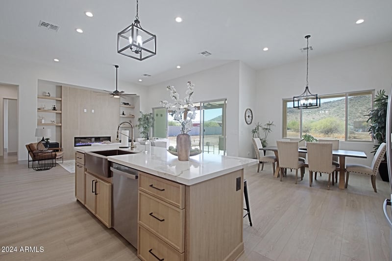Listing details for 1235 Hohokam Ln, New River, AZ 85087 : Come see your dream home, desirable Circle Mountain, New River, brand new custom home on over 1.2 acre lot with no HOA, completed and ready to move-in. Stunning mountain views, S/N exposure, front yard landscaping, level usable land, no flood zone. Split floor plan with spacious kitchen open to great room 12 ft ceilings, large kitchen island, 4 bedrooms+den, 3 baths, extended 4 car garage 29 ft deep. Highly upgraded with luxury vinyl flooring t/o, Custom Rift Oak skinny rail cabinets, Quartz countertops, farm sink, GE stainless steel appliances including fridge, 10 ft wrought iron front door, electric fireplace with tile finish wall in great room. Master suite with separate exit to back patio, double sinks, large tiled shower, jetted tub, large walk-in closet. Large covered patio... Private location with stunning mountain views, in area of all custom homes, patios finished with pavers. Nice level lot with deep backyard. Laundry room and garage utility sinks, electric water heater with recirculating pump, water softener, 2 Trane HVACs. Window blinds, ceiling fans... Oversized 1296 sf 4 car garage, 29 ft deep , garage epoxy... Lot coverage 25%, additional 5,000 sf can be build on this lot, RV garage, guest house, workshop...