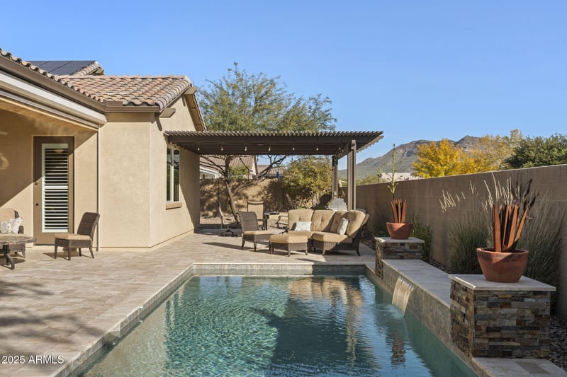 Listing details for 1241 102nd St, Mesa, AZ 85207 : Built in 2019, this beautifully designed 3,686 sq ft home has room for all your toys plus a great floorplan with 4 spacious bedrooms, 3 bathrooms & 2 bonus rooms! An inviting open plan features a stunning chef's kitchen with Superstition Mountain views, stainless appliances, double ovens, gas cooktop, and huge island/breakfast bar. The beautiful backyard is perfect for relaxation with a sparkling heated pool, travertine hardscape, low-maintenance landscaping, and a built-in BBQ and ramada. The oversized 3-car garage with built-in storage is complemented by a rare 50FT RV garage, already plumbed for a future 1/2 bath. Energy efficiency shines with owned solar and a Tesla Powerwall, delivering outstanding utility savings!