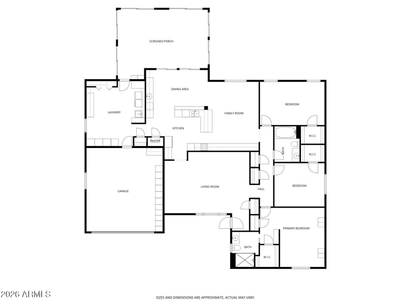 from the kitchen and family room into an expansive bright and sunny Arizona Room overlooking the oversized corner lot with a coveted North/South orientation. The low maintenance landscaping has been upgraded with new irrigation lines and new plants. Each of the 3 bedrooms are spacious and includes a walk-in closet. The Primary Bathroom features a dressing area, make-up vanity and walk-in shower. The expansive laundry room includes a sink, built-in cabinetry and space for an in-home office, exercise equipment, a craft room or perhaps a play area for grandchildren. The immaculate garage has a new epoxy floor, new paint and enough space for a golf cart! With NO HOA this home truly represents the best of retirement living!