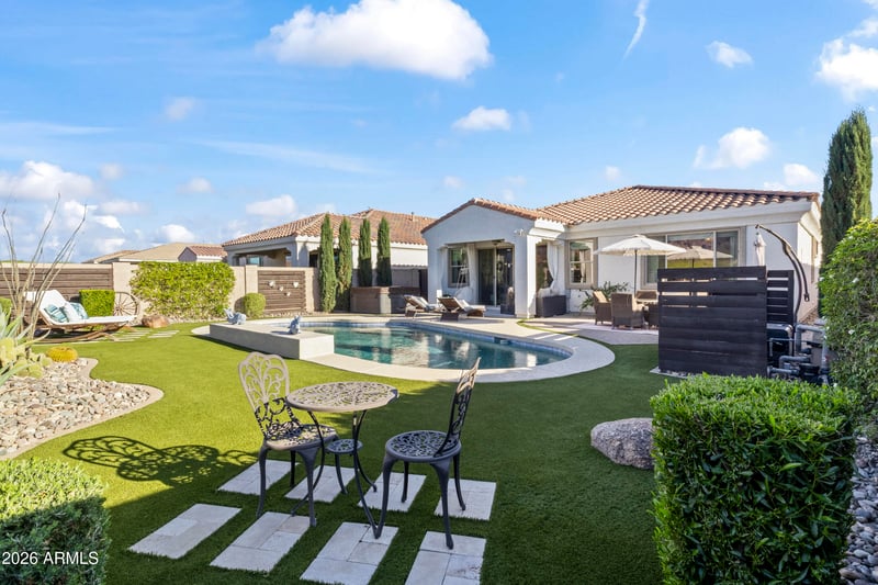 Step outside to your private backyard oasis, complete with a heated pool for year-round enjoyment. Perfect for relaxing evenings or entertaining guests under the Arizona sky.