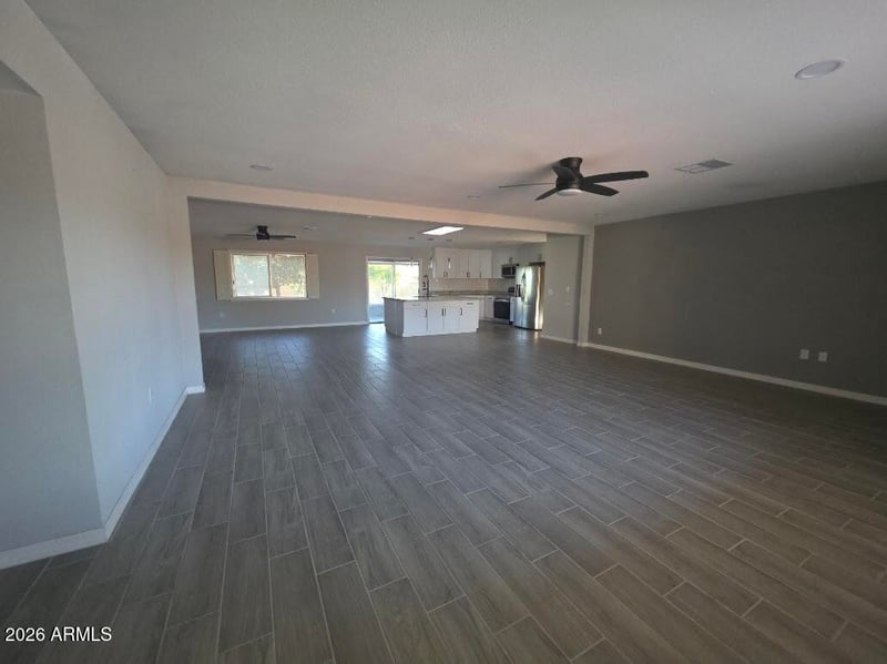 This open floor plan is perfect for entertaining or relaxing, with ceiling fans adding comfort and style.
