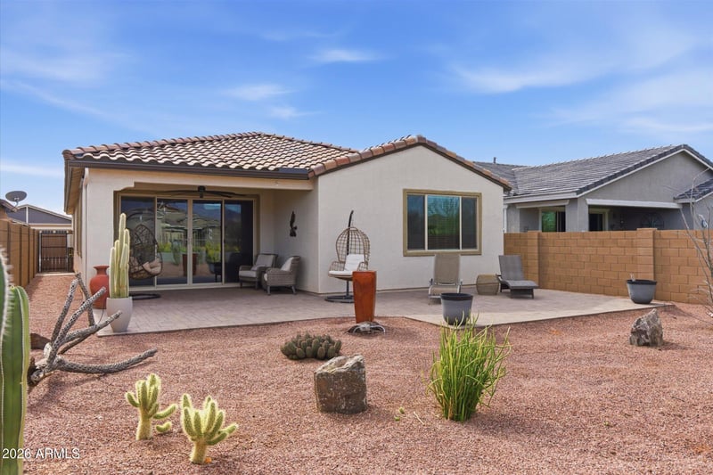 Listing details for 12538 Pivot Peak --, Gold Canyon, AZ 85118 : Backyard Landscaping MODIFIED - SEE NEW PHOTOS. Stunning 1960 square feet, 4 bed, 3 bath single-level home in Gold Canyon's Peralta Canyon community! Fully furnished (see list). Built in 2021 with breathtaking views of the Superstition & Dinosaur Mountains from the backyard, great room, kitchen, and primary suite. Serene backyard with covered patio, extended paver patio, and serene water feature. Kitchen appointed with quartz counters, espresso cabinets, gas cooktop, walk-in pantry. Primary Bedroom offers a large tiled shower with bench & double sinks. Tile throughout the main areas (carpet in bedrooms only) -enough new matching tile for the primary bedroom - stored in the garage. Washer/Dryer/Fridge included.