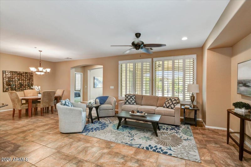 Listing details for 12612 Fetlock Trl, Peoria, AZ 85383 : Experience the active adult lifestyle at Trilogy at Vistancia! This highly sought-after 2-bed plus den home features great curb appeal and a freshly painted exterior. Inside you are greeted by tile flooring, vaulted ceilings, large windows providing natural light with stylish shutters. The gourmet kitchen boasts granite counters, an island, bar seating, tons of cabinet space and a gas stove. A spacious primary suite offers a bay window, double sinks, and a walk-in shower/closet. Enjoy the Arizona weather on your covered patio. Recent updates include a water softener (2023), Trane AC (2021), and water heater (2023). Enjoy world-class amenities like the Kiva & Mita Clubs, 3 pools, Alvea Spa, V's Taproom, golf course, fitness centers, and pickleball. Endless clubs and activities await!