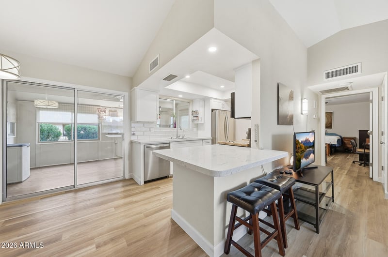 Step inside to vaulted ceilings and new flooring throughout, creating a bright, open feel. The newly remodeled kitchen features quartz countertops extended counter space & an open concept design. This home comes fully equipped with all appliances (refrigerator, washer, and dryer) making this home truly move-in ready. The Arizona room provides additional living space ideal for relaxing, hobbies, or entertaining.While the extended covered back patio and expanded concrete at the courtyard in the front offer multiple outdoor areas to enjoy Arizona's sunshine.The primary bedroom includes a walk-in shower and walk-in closet and a split floor plan that provides privacy for guests. Major improvements add peace of mind, including a NEW ROOF, NEWER DUEL PANE WINDOWS, RECENTLY PAINTED EXTERIOR, RAIN GUTTERS, and extra garage venting to help keep the garage cooler year-round.