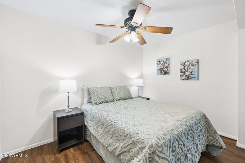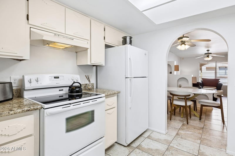 Listing details for 12635 La Montana Dr #2, Fountain Hills, AZ 85268 : FULLY FURNISHED! Adorable condo near the heart of everything happening in Fountain Hills! Across the street for the International Dark Sky Discovery Center, Community Garden, Community Center & more! Lots of great living spaces...the large living and dining area plus a big enclosed patio space. The kitchen features granite counters and newer appliances, plus nice cubbies for extra storage space. The primary closet is HUGE and there's even an office nook off the primary. The community has a lovely pool and onsite laundry room. So much value for the price!