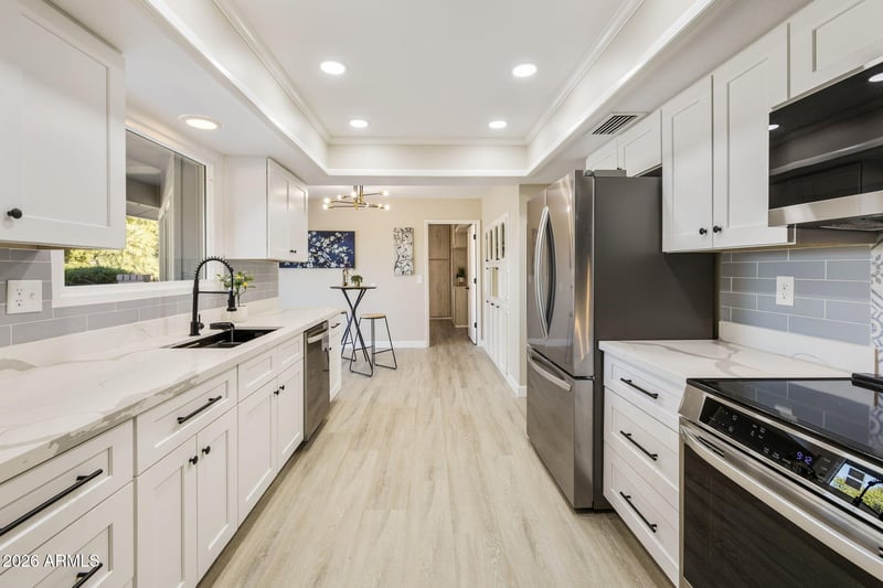 The gorgeous kitchen features all-new white shaker cabinetry (soft-close), Quartz countertops, and a full-height pretty backsplash. NEW induction/convection range/oven and a professional ''workstation sink'' with a view of the back yard. Enjoy two separate living spaces, formal dining if you choose and a breakfast nook overlooking the private walled patio—a sanctuary for hummingbirds.