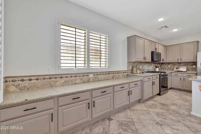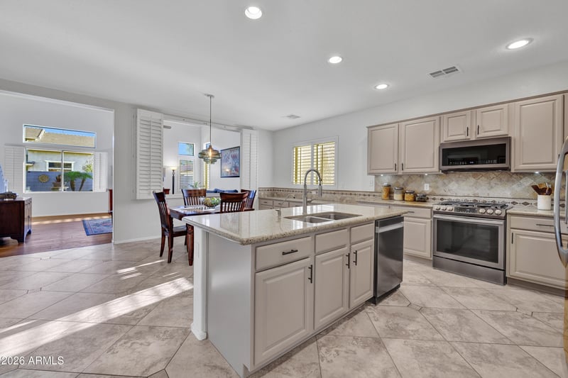 A highly desirable first-floor bedroom with a nearby full bath offers an ideal setup for next-generation living, perfect for guests or extended family. Car enthusiasts and hobbyists will appreciate the three-car tandem garage, complete with built-in cabinetry, a workbench, and specialty epoxy flooring. The backyard is designed for relaxed Gilbert living, featuring lush landscaping, a sparkling pool with water features, and a built-in fire feature. Enjoy outdoor entertaining with surround sound, a covered patio for year-round comfort, and a fully equipped outdoor island with a built-in grill.
