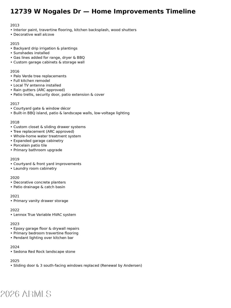 Listing details for 12739 Nogales Dr, Sun City West, AZ 85375 : Set within the prestigious Corte Bella Country Club, this exceptional San Marco residence offers refined luxury designed for an active and elegant 45+ lifestyle. Ideally positioned and impeccably maintained, the home is truly move-in ready with thoughtfully curated upgrades throughout. Recent enhancements provide both peace of mind and modern comfort, including a newer HVAC system (approx. 3 years), Andersen windows and slider across the rear of the home, shutters in every room, a new water heater, roof tune-up, extended patio cover, and landscape lighting. The kitchen has been beautifully reimagined for today's discerning buyer, featuring high-end appliances, & newer cabinetry—blending function with sophisticated design. A generous island anchors the space, offering views of the charming front courtyard and the serene backyard garden oasis, perfect for entertaining or everyday enjoyment. This split-floorplan design includes two bedrooms and a versatile den, with the primary suite privately situated for comfort and retreat. The spa-inspired primary bathroom shows a luxurious rainfall walk-in shower, updated countertops, and a spacious walk-in closet, while the bedroom enjoys peaceful views of the meticulously designed backyard. Smooth-surface tile flows through the living areas, primary suite, and office, reinforcing the home's clean, upscale aesthetic. Outdoors, the elevated backyard captures breathtaking sunset views along the tree line. The professionally designed landscaping, hardscape, and BBQ area create a tranquil oasis carefully planned with ambient lighting, mature trees, and flowering plants to enhance relaxation and outdoor living. The oversized 2.5-car garage includes a water conditioning system and utility sink, ideal for both convenience and an active country club lifestyle. This is luxury retirement living at its finest, where elegance, comfort, and the Corte Bella lifestyle come together seamlessly.