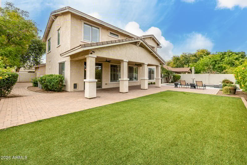 Listing details for 1280 Azalea Dr, Gilbert, AZ 85298 : Beautifully updated two-story home with resort-style backyard and sparkling pool. Open-concept kitchen features granite counters, stainless appliances, tile flooring, and abundant cabinetry. Spacious living areas with modern fireplace and plantation shutters throughout. Downstairs bedroom and full bathroom with walk-in shower offer ideal guest or multi-gen living. Recent upgrades include owned out right solar panels, new AC units in 2024, and foam-insulated attic for energy efficiency. Covered patio, low-maintenance landscaping, and ample parking complete this move-in-ready home. Convenient location near schools, shopping, and dining.