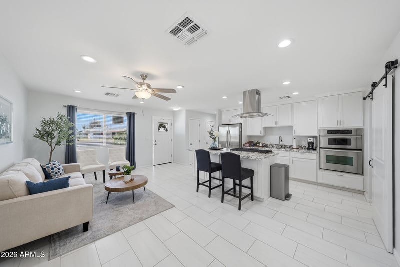 Inside, the home has been thoughtfully updated with modern finishes throughout. Tile flooring runs throughout the home for easy maintenance and a clean, contemporary feel. Both bathrooms have been fully remodeled with gorgeous modern touches that create a spa-like experience.