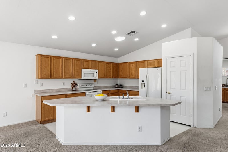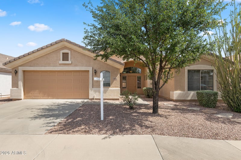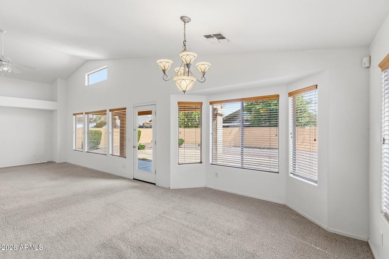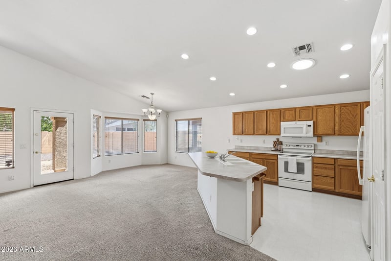 Listing details for 12826 Windrose Dr, El Mirage, AZ 85335 : This 3-bed, 2-bath residence offers a bright and open great room layout, enhanced by vaulted ceilings that create an airy, inviting atmosphere.