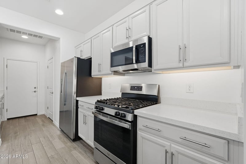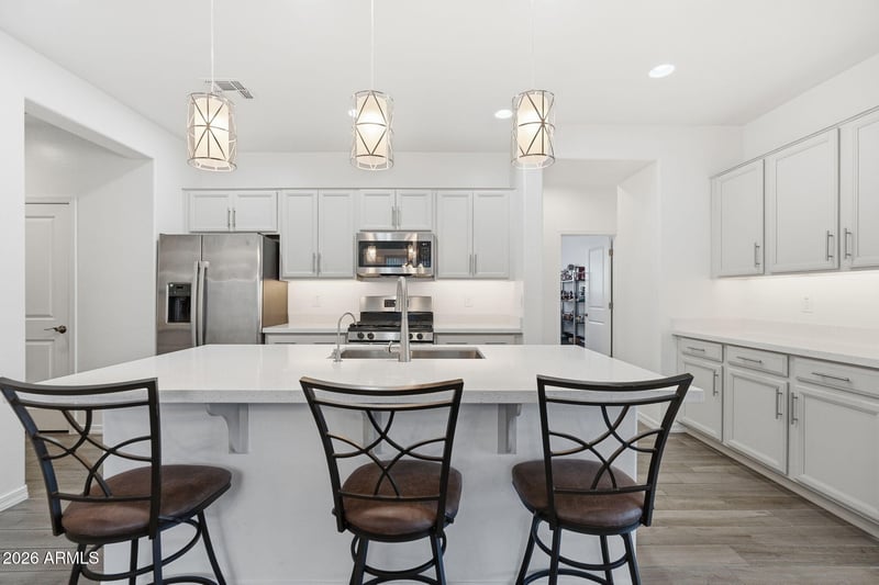 Listing details for 12844 Tuckey Ln, Glendale, AZ 85307 : Meticulously maintained 4 bed, 3 bath home with 1,970 sq ft in the desirable Falcon Ridge community. Built by Taylor Morrison, this home features great curb appeal with stone accents, paver driveway, and manicured desert landscaping. Open floor plan with abundant natural light, tile flooring, and neutral tones throughout. Kitchen offers white cabinetry, quartz counters, stainless steel appliances, gas range, walk-in pantry, and large island with breakfast bar. Spacious primary suite with dual vanities, soaking tub, and walk-in shower. Backyard includes artificial turf, paver patio, and covered patio. North/south exposure and 3-car garage complete this move-in ready home.
