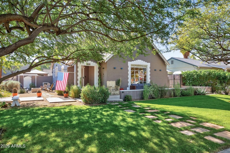 Drenched in natural light, with 3-bedrooms and 2.5-bathrooms, the home is framed by mature front landscaping featuring multi-trunk mesquite trees, flowering plants, succulents, and shrubs, creating a welcoming sense of arrival. Multiple outdoor living spaces surround the home, including a front patio, fire pit seating area, side-yard outdoor dining, and a private backyard retreat with turf, shaded seating, large paver patio, pool, custom solid-wood pergola. A two-car garage is ready for future conversion into a pool house or creative space. Inside, original 84-year-old wood floors remain in excellent condition and are complemented by plaster walls and ceilings, coved ceilings, a wood-burning fireplace, and original built-ins that reflect the home's craftsmanship and era.