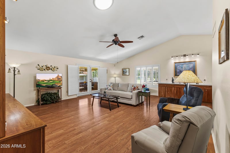 Listing details for 13047 Ballad Dr, Sun City West, AZ 85375 : Expanded Pima model with a prepaid solar lease for lower APS bills on this all-electric home! Featuring a spacious great room with vaulted ceilings, a built-in entertainment center, buffet with a granite countertop, and French doors leading to a relaxing screened-in patio overlooking the HOA-maintained greenbelt. Tasteful updates throughout include newer windows, laminate and tile flooring, plantation shutters, and a kitchen with granite countertops, stainless steel/black appliances, and cabinets with pull-outs. The primary suite features a charming bay window and a generous walk-in closet. A dedicated office includes built-ins for ample storage, plus additional built-ins in the garage. HOA covers exterior paint, roof repairs, water, common area maintenance, & more! Pets OK; no rentals.