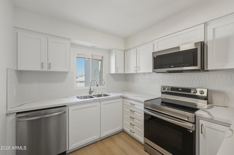 The updated kitchen shines with quartz countertops, new stainless steel appliances, white shaker cabinetry, tile backsplash, and a convenient breakfast bar—perfect for easy entertaining. Both bathrooms feature new tile surrounds, quartz counters and modern finishes. A recently replaced HVAC system adds even more peace of mind.
