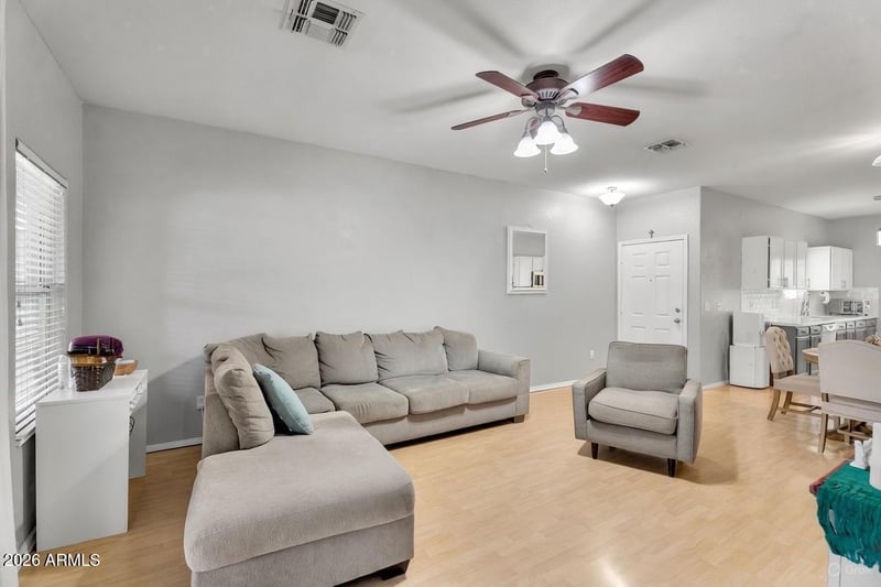 Listing details for 13122 Calavar Rd, Surprise, AZ 85379 : Gorgeous, well-kept home ready for you to move right in! The seller spared no expense. New quartz counters in the kitchen and baths, added patio roof, fresh pavers, and a peaceful backyard seating area perfect for Arizona days. Inside, enjoy an open floorplan with laminate flooring, modern gray tones, and a gourmet kitchen featuring stainless steel appliances, subway tile backsplash, quartz counters, pantry, and plenty of storage. The lovely primary suite offers a walk-in closet, dual vanity, and a large tub/shower combo. The backyard is built for entertaining with an oversized covered patio, concrete and paver extensions, plus a newer AC for energy-efficient comfort!