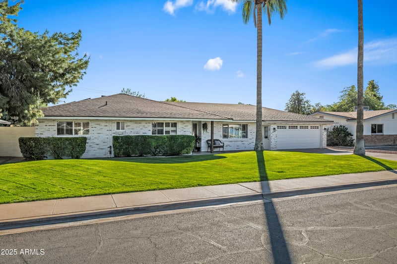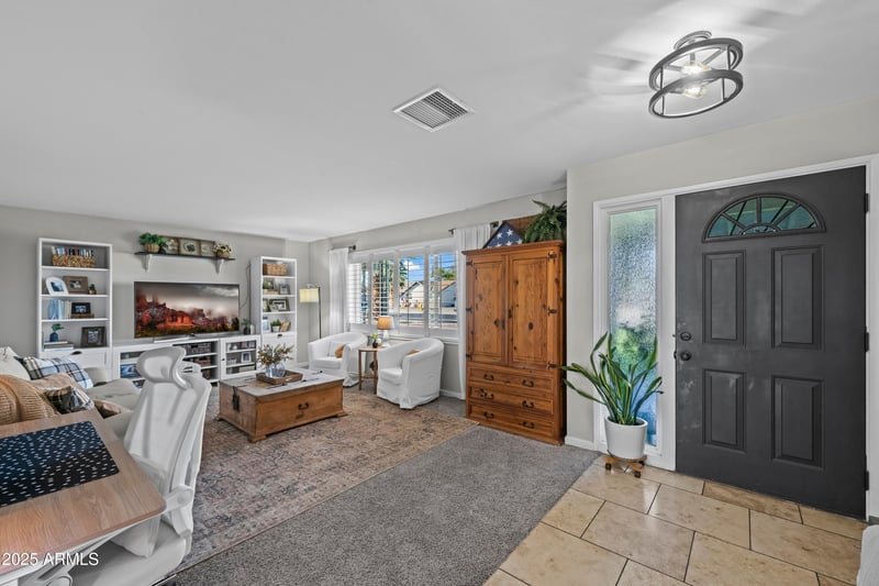 Listing details for 1323 Downing St, Mesa, AZ 85203 : Welcome home to this beautifully updated 1,692 sq ft property featuring great curb appeal with a grassy front yard, mature palm trees, and pavers near porch. Inside, you'll find a spacious living room and double-pane windows with shutters in the living room and bedrooms. The inviting kitchen offers butcher block countertops, abundant cabinetry with new hardware, and opens to the dining area and a cozy family room complete with a built-in entertainment center.
