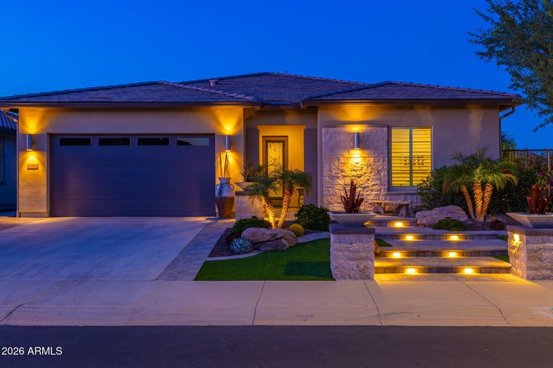 Listing details for 13342 Blackstone Ln, Peoria, AZ 85383 : Exquisite Montage model located within the prestigious guard-gated Trilogy® at Vistancia, a premier golf community offering resort-style living. This refined floor plan features two private primary suites, a den with French doors and a custom smart room with dual built-in desks and cabinetry. Over $100K invested in professionally designed landscaping with outdoor kitchen, separate gas fire wall and decorative fountain, bocce court, putting green, and above-ground spa, ideal for elevated indoor-outdoor living. Chef's kitchen with leathered granite, dual built-in ovens, custom pull-out cabinetry, upgraded lighting, and wood-look tile flooring. A 12' disappearing glass wall opens to the private patio. Plantation shutters, surround sound, paid-in-full solar, soft water with RO, and extended garage with epoxy floors and built-ins complete this exceptional offering.