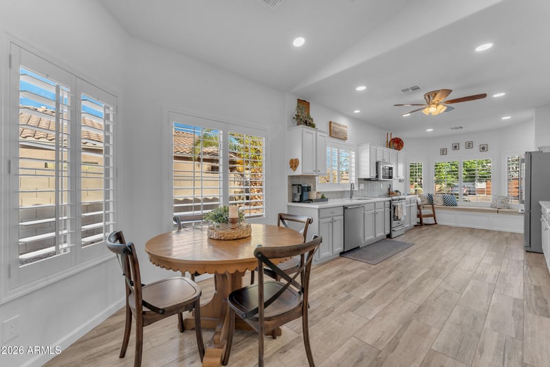 Listing details for 13359 Gelding Dr, Surprise, AZ 85379 : This beautifully remodeled single-story home offers light-filled living and thoughtful updates throughout. The open floor plan features wood-look tile flooring, vaulted ceilings, and an expanded kitchen with quartz countertops, custom backsplash, stainless appliances, and abundant cabinetry. Plantation shutters frame bright windows, while the dining nook and living area flow seamlessly for everyday living, as well as entertaining. The primary suite is a true retreat with a fully remodeled bath showcasing a spacious walk-in shower and modern finishes. Outside, enjoy a cozy, private backyard with paver patio, large covered seating area, and ceiling fans to enjoy Arizona evenings. Ideally located near shopping, dining, spring training, and more. Come for a tour before this one gets away!