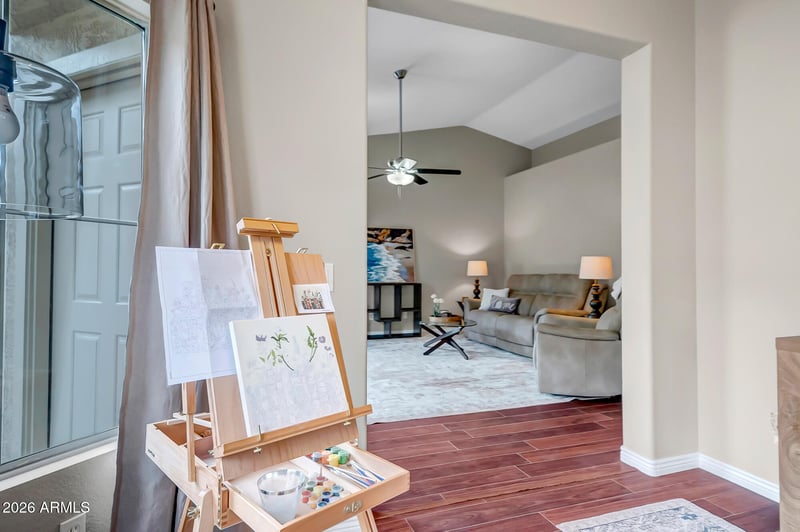 Listing details for 13377 Evans Dr, Surprise, AZ 85379 : Step inside and you'll immediately notice the vaulted ceilings that create an airy atmosphere throughout multiple living spaces. The open living room showcases fresh paint and sleek laminate flooring that flows seamlessly through the home. Your new kitchen is a culinary dream, featuring brand-new stainless steel appliances, including a Samsung refrigerator and an LG convection oven range. Freshly painted cabinets with updated hardware, a reverse osmosis water system, and a bright breakfast nook make morning routines something to look forward to.