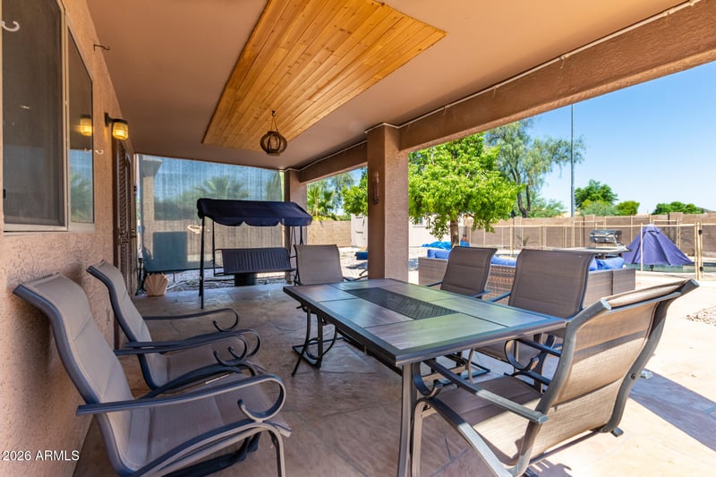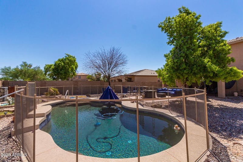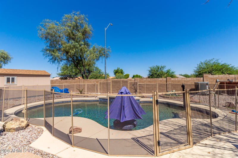 Listing details for 1340 12th St, Casa Grande, AZ 85122 : Welcome to your private desert oasis! This stunning Casa Grande home at 1340 E 12th St offers the perfect blend of comfort and entertainment. The heart of this home is the expansive backyard, featuring a sparkling pebble-tec pool with a dedicated safety fence, a large covered patio with custom wood ceiling accents, and plenty of room for lounging under the sun.