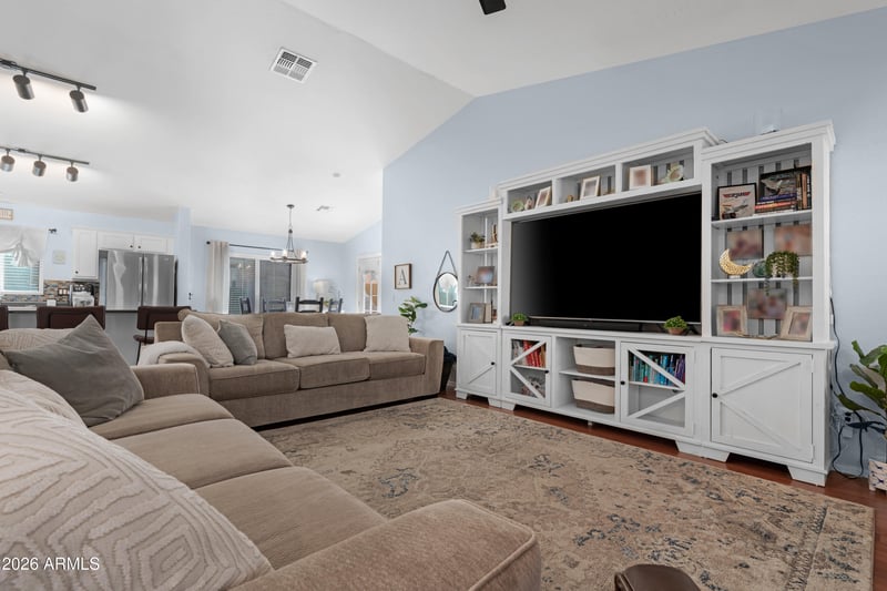 Listing details for 1343 Bradstock Way, San Tan Valley, AZ 85140 : Beautifully updated 3 bed, 2 bath home with vaulted ceilings, wood floors, and a bright open layout connecting the family room, kitchen, and dining area. The kitchen shines with painted cabinets, glass & stone backsplash, stainless steel appliances, island with breakfast bar, double pantry, and ample storage. Split floor plan offers privacy. Spacious primary suite includes a walk-in closet and updated bath with double vanity, new mirrors, faucets, and painted vanity. Secondary bedrooms and den feature newer flooring and upgraded ceiling fans. Recent improvements include updated interior/exterior lighting, new water heater, recent interior paint, and exterior paint just 2 years ago. Large backyard with covered patio, Ramada, and lush grassy yard backs to a greenbelt. Private and peaceful.