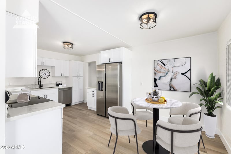 Listing details for 1346 41st Ave, Phoenix, AZ 85009 : Seize the chance to own this delightfully updated 4-bedroom property! You're greeted by a low-maintenance yard and an RV gate for convenience. Discover a thoughtfully renovated interior featuring a soothing palette, blinds, and attractive wood-look flooring. The upgraded eat-in kitchen comes with quartz counters, white shaker cabinetry, and sleek stainless steel appliances for a seamless cooking experience. The main bedroom includes a private bathroom for added comfort. You'll also find a practical laundry room with a brand-new washer and dryer. Unwind at the end of a long day in the backyard, which offers a covered patio, a storage shed, and ample space for crafting your dream outdoor oasis. Don't miss out on this revitalized property!